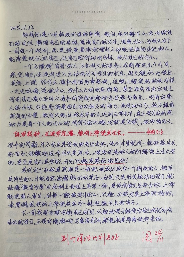 写周记是一件极有价值的事情,能让我们静下心来回顾自己的过往,整理自己的思绪,看清自己的不足,省察内心,为明天为下一周有一个计划。总是很羡慕那些“雷打不动”能坚持写日记的人,能清楚地认识自己,让自己的行动有目标,顺从自己的内心。