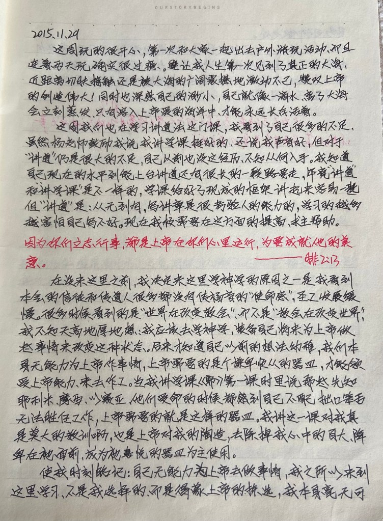 使我时刻铭记:自己无能力为上帝去做事情,我之所以来到这里学习,不是我选择的,而是得蒙上帝的拣选,我本身毫无可自夸、可骄傲之处。