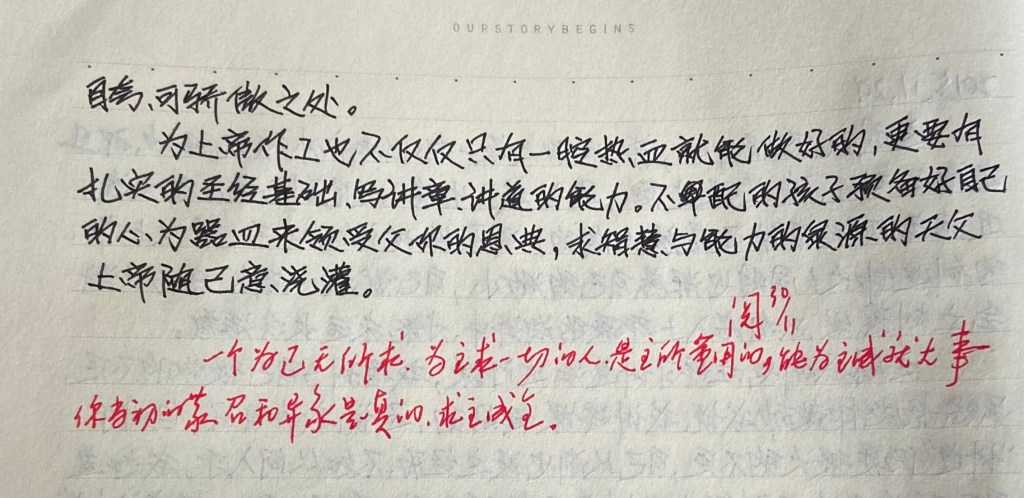 为上帝做工也不仅仅只是一腔热血就能做好的,更要有扎实的圣经基础、写讲章、讲道的能力。不配的孩子预备好自己的心为器皿来领受父你的恩典,求智慧与能力泉源的天父上帝,随己意浇灌。