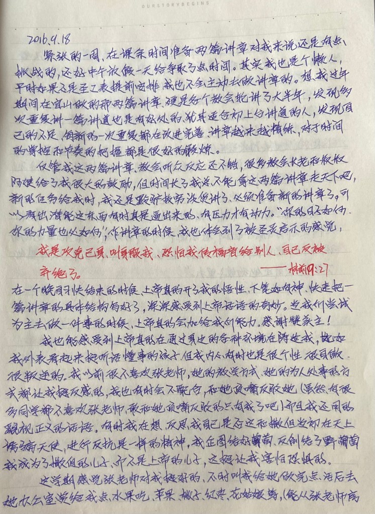 尽管我这两篇讲章,教会听众反应还不错。很多教会长老和叔叔阿姨给了我很大的鼓励,但时间长了我总不能拿这两篇走天下吧,新的任务给我时,我还是黔驴技穷没货讲了,必须要准备新的讲章了。可以看出潜能这东西有时真是逼出来的,有压力才有动力。“你的日子如何,你的力量也必如何”,做讲章的时候,我也体会到了被圣灵启示的感觉,在一个晚自习快结束的时候,上帝真的开了我的悟性,下笔如有神,快速把一篇讲章的具体结构写好了,深深感受到上帝话语的奇妙。当我们尝试为主去做一件事的时候,上帝真的会加给我们能力。感谢赞美主!