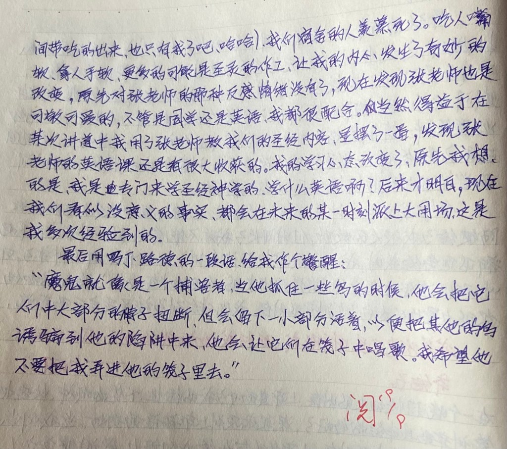 这学期感觉张老师对我挺好的,不时叫我给它做完点活后去她办公室赏给我点水果吃,苹果、桃子、红枣、花姑娘等(能从张老师房间带吃的出来,也只有我了吧,哈哈。)我们宿舍的人羡慕死了。吃人嘴软,拿人手软,更多的可能是圣灵的作工,让我的内心发生了奇妙的改变,原先对张老师的那种反感情绪没有了,现在发现张老师也是可敬可爱的,不管是国学还是英语,我都很配合。当然得益于在某次讲道中我用了张老师教我的圣经内容,显摆了一番,发现张老师的英语课还是有很大收获的。我的学习心态改变了,原先我想的是,我是专门来学圣经神学的,学什么英语啊?后来才明白,现在我们看似没意义的事情,都会在未来的某一时刻派上大用场,这是我多次经验到的。